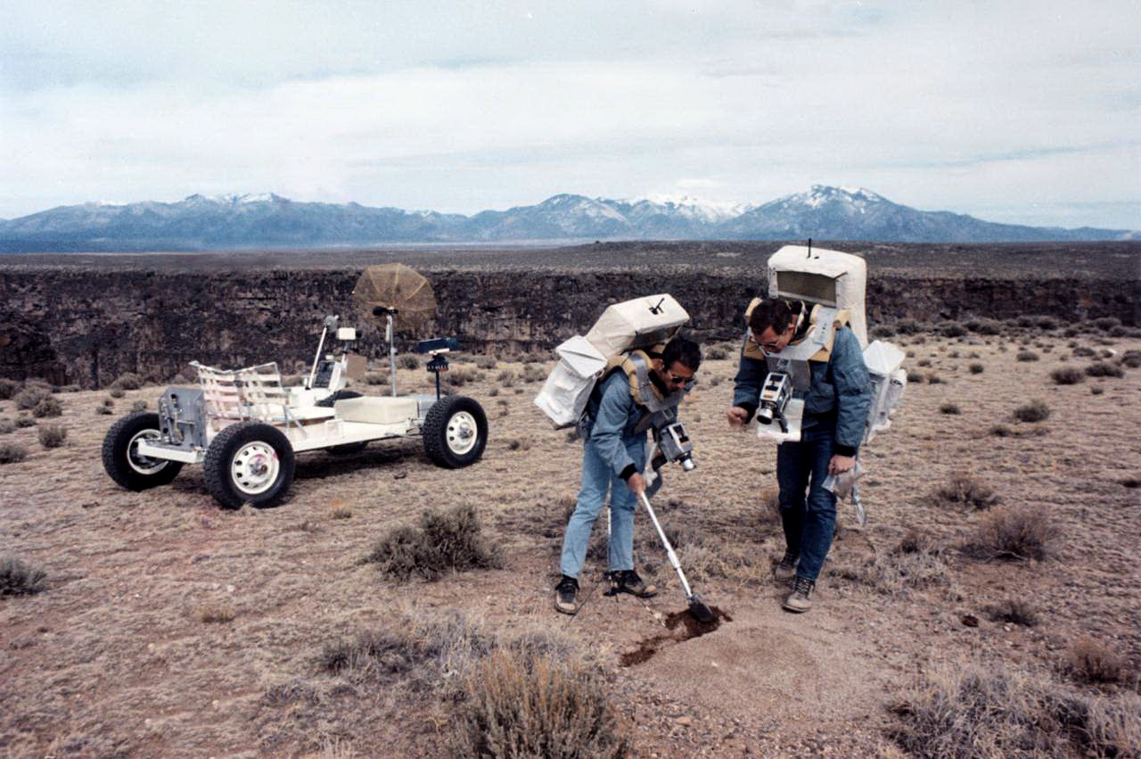 За год, с мая 1970 по май 1971 года, астронавты побывали в 16 геологических экспедициях. На снимке: Джеймс Ирвин и Дэвид Скотт во время полевых занятий по геологии в штате Нью-Мексико. Слева — тренировочная модель «Лунного Ровера»